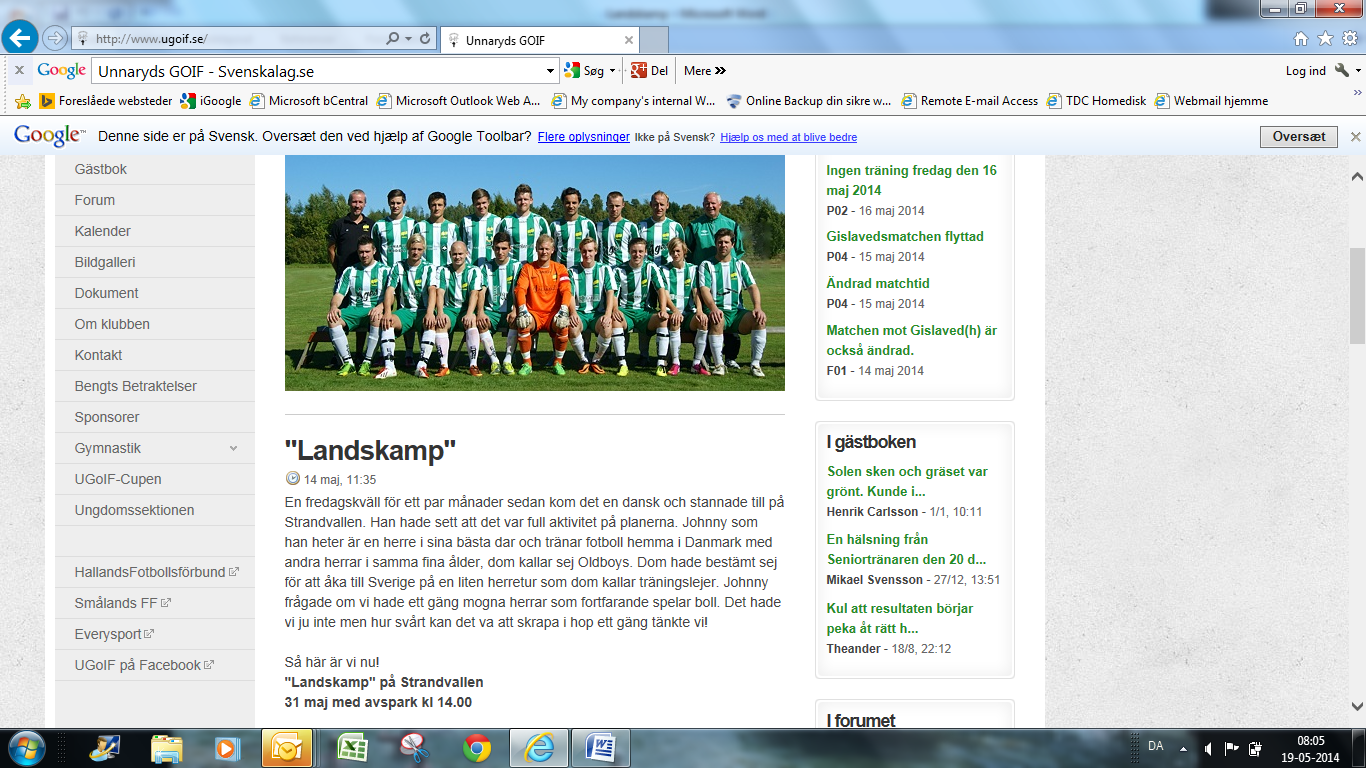 Der er fodbold på programmet på denne træningslejr, idet holdets aktive spiller, Johnny Larsen, har arrangeret en "landskamp" mod den svenske klub Unnaryds GOIF´s ældste spillere. Denne "landskamp" spilles lørdag den 31. maj med kampstart kl. 14.00.
