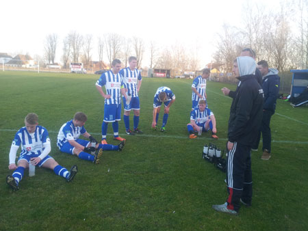 I pausen får spillerne instrukser af trænerne, Henrik Post, Morten og Clemme.