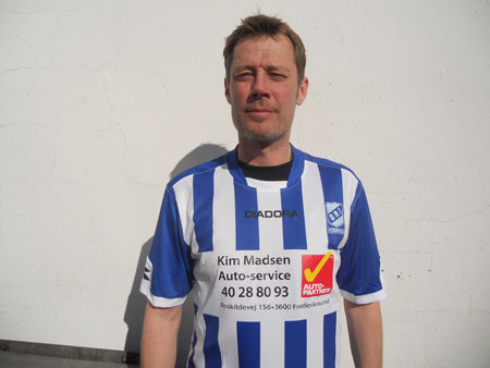 Kim Madsen med den nye kamptrøje, som han har sponseret til ORI-Fodbold's veteranhold.